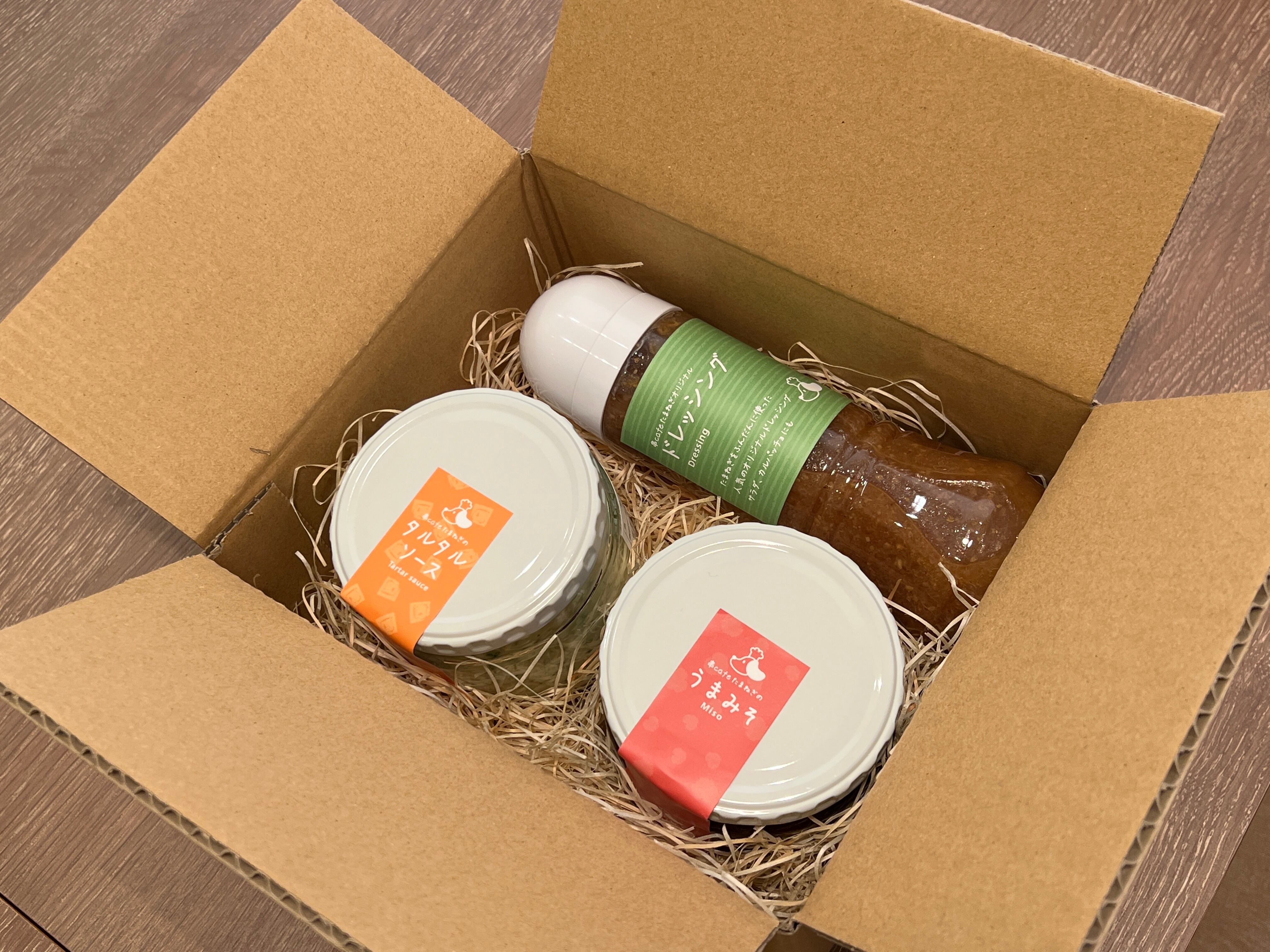 セットには、お店で大人気!リピーター続出の”ドレッシング”、”赤味噌”、”タルタルソース”の3つの味が詰まっています。料理にアクセントを加えたり、お好みの味付けを楽しむことができます!お料理のレパートリーが増えること間違いなしです!!
